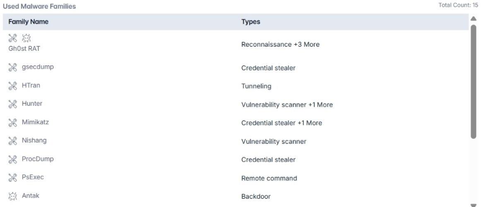 Emissary Panda’s toolkit comprises roughly 15 distinct malware families and common offensive utilities, mixing custom backdoors and widely available admin tools repurposed for intrusion and lateral movement. Notable families and utilities associated with the group include:
